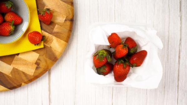 只在吃草莓或制作食谱之前清洗草莓。如果你已经洗了一批草莓,用纸巾拍干。