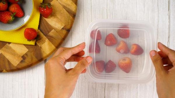 容器通常效果最好,但在使用之前要确保它们是安全的。冰箱安全的塑料拉链袋是另一种选择。把草莓松松地包起来,以免形成一大块。通常在顶部留出1/2到1英寸(1.25-2厘米)的空间是个好主意
