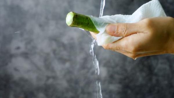 Defuzz秋葵。小秋葵在烹饪之前不需要去除上面的绒毛。从老秋葵中去除它:在自来水下去毛。用尼龙洗涤剂、纸巾或蔬菜刷轻轻摩擦豆荚。用抹布把秋葵拍干,或者把它摊开晾干。