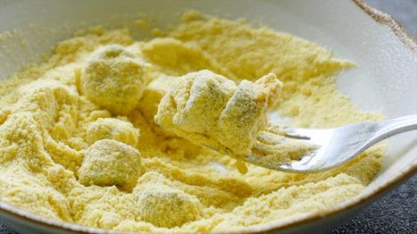 浸泡一段时间后,将切片捞入玉米粉中,均匀覆盖。