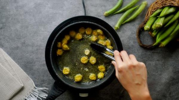 不断搅拌,确保它不会烧焦。将秋葵炒2分钟至金黄,捞出,用纸巾沥干水分。享受。